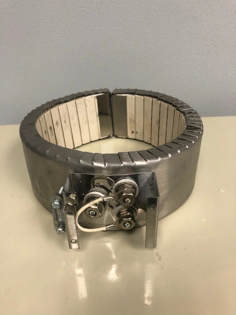 Ceramic insulated fiber electric band heater, maximum temperature 1400F, 240/460V AC, 1600 watts, approximate inside diameter 6.00″, approximate outside diameter 7.00″, approximate width 2.50″